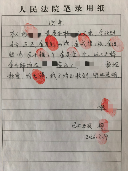 当天,法庭干警全程见证,联合金店工作人员对首饰重量、品类、成色逐一细致查验,同时耐心释法明理、疏导情绪。透明公正的核验过程打消了双方顾虑,最终顺利完成首饰交接与4万元现金交付,苏某当场出具收据,纠纷圆满落幕。