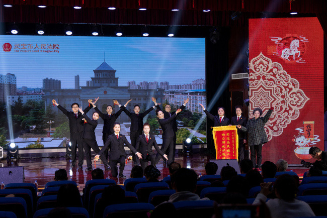 下半场节目同样“干货满满”:五亩法庭牵头创作的情景快板《八旬老太讨债记》,取材真实办案故事,以朗朗上口的台词再现干警为老人追回欠款的暖心历程,让司法温度直抵人心;剑韵太极《云水禅心》刚柔并济,行云流水的招式尽显传统文化魅力,也展现了干警沉稳从容的另一面;老干部党支部模特走秀《万疆》大气磅礴,退休老干部与在职干警携手登台,迈着自信步伐走出灵法人风采与家国情怀。